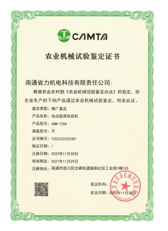 11月30日,省力科技4UM-120电动蔬菜收获机、省力科技4UM-120A电动蔬菜收获机通过江苏省农业机械试验鉴定站鉴定,取得农业机械试验鉴定证书。2021年3月,《叶类蔬菜收割机》农业机械推广鉴定大纲首次发布,专家组对机具工作现场查定、用户满意度跟踪后,一致认定省力科技两款电动蔬菜收获机性能指标、机具适用性及可靠性均符合农业机械推广鉴定大纲要求。