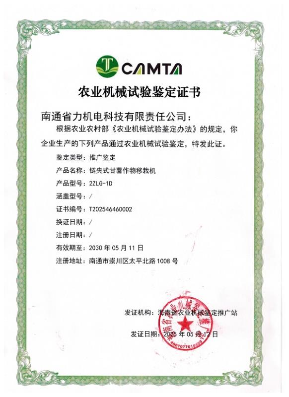 2025年 5月,依据《甘薯移栽机(DG/T272-2022)推广鉴定大纲》省力科技2ZLG-1D电驱动链夹式甘薯作物移栽通过国家农机推广鉴定。