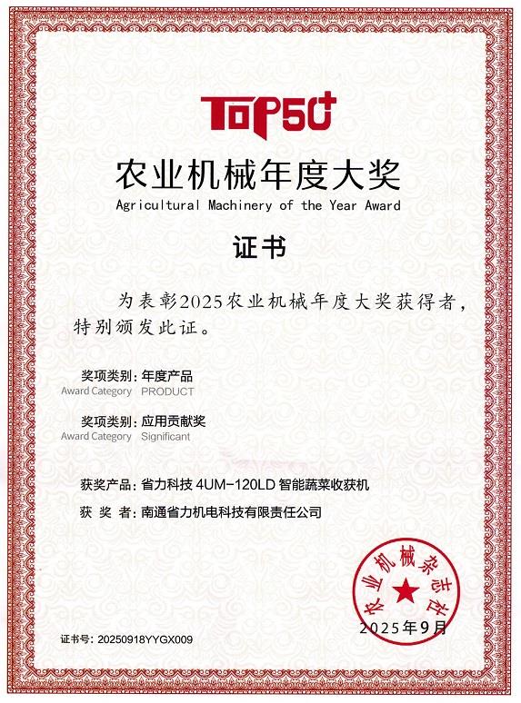 9月18日,省力科技4UM-120LD智能蔬菜收获机荣获2025农业机械年度TOP50+“应用贡献奖”。